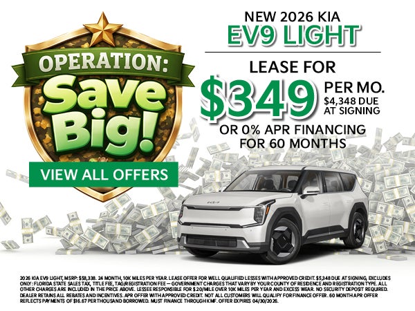 2026 KIA EV9 LIGHT, MSRP: $58,338. 24 MONTH, 10K MILES PER YEAR. LEASE OFFER FOR WELL QUALIFIED LESSES WITH APPROVED CREDIT. $5,348 DUE AT SIGNING, EXCLUDES ONLY: FLORIDA STATE SALES TAX, TITLE FEE, TAG/REGISTRATION FEE — GOVERNMENT CHARGES THAT VARY BY YOUR COUNTY OF RESIDENCE AND REGISTRATION TYPE. ALL OTHER CHARGES ARE INCLUDED IN THE PRICE ABOVE. LESSEE RESPONSIBLE FOR $.20/MILE OVER 10K MILES PER YEAR AND EXCESS WEAR. NO SECURITY DEPOSIT REQUIRED. DEALER RETAINS ALL REBATES AND INCENTIVES. APR OFFER WITH APPROVED CREDIT. NOT ALL CUSTOMERS WILL QUALIFY FOR FINANCE OFFER. 60 MONTH APR OFFER REFLECTS PAYMENTS OF $16.67 PER THOUSAND BORROWED. MUST FINANCE THROUGH KMF. OFFER EXPIRES 04/30/2026.